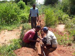 Pastor Evans and friends search out the best three mile path for water pipeline through the bush.